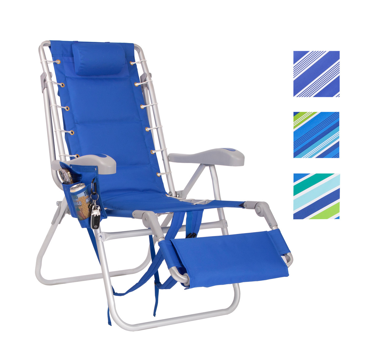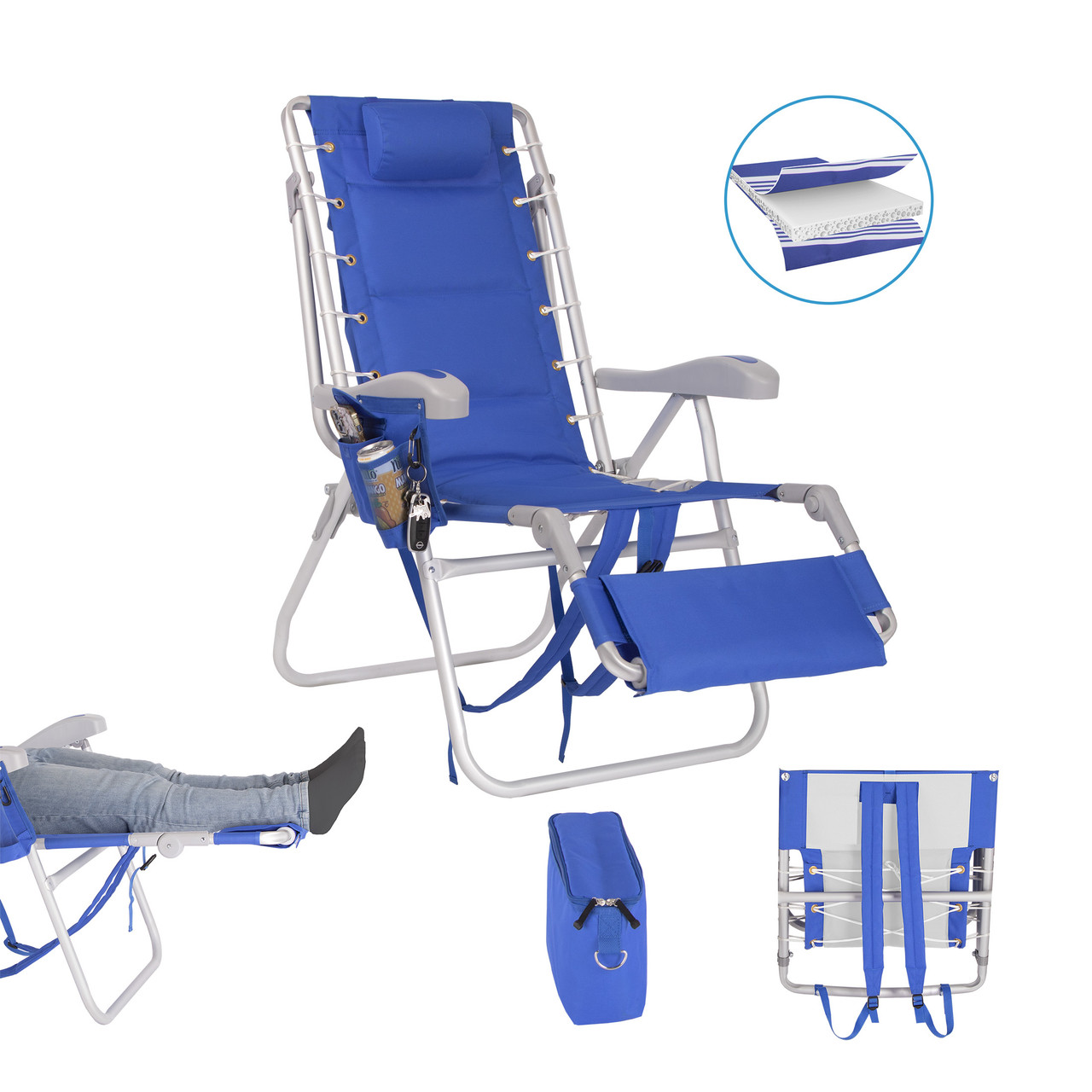 The Ultimate Heavy Duty Padded Backpack Beach Chair for adults features a tall 17" high seat for easy in and out comfort, ideal for adults, seniors, and taller individuals. Designed in a lounger-style format, it offers a spacious 20" wide seat and 27.3" backrest height for enhanced upper-body support. Lace suspension with silk wadding padding provides breathable, flexible comfort. Reclines in 5 positions with adjustable footrest. Includes insulated cooler pouch and backpack portability. Built with a rust-resistant aluminum frame supporting up to 300 lbs and durable 600D polyester fabric